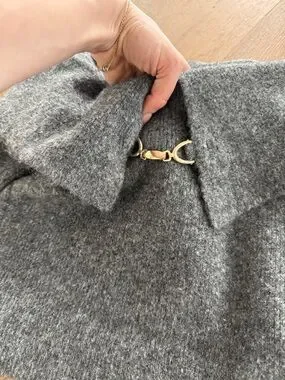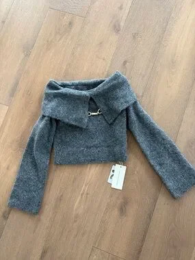 Commense top size XS. BRAND NEW with tags. Soft gray off-shoulder knit sweater with a wide foldover collar and gold-tone decorative clasp. Cropped silhouette with long sleeves for a modern, cozy look. Versatile gray color pairs easily with jeans or skirts.