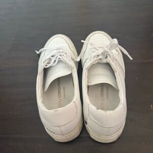 Sleek white leather sneakers. Minimalist design. Comfortable fit.