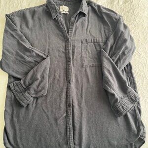 Community brand from Aritiza - A light navy with a faded look blue button up with one front pocket. The fading is the style of the top!