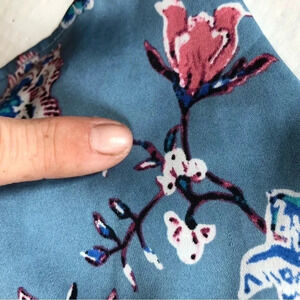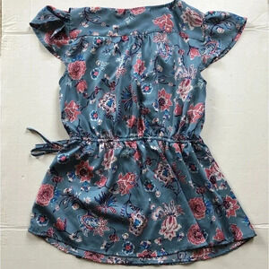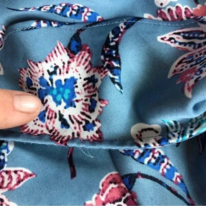 Wrap style front with a clasp to keep the front together. Blue background with pink florals. Super cute and comfy top.