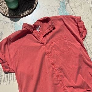 Como Vintage coral pink button up short sleeve shirt / blouse. 97% tencel, 3% spandex, tagged as a size medium. Measures 27" across shoulders (drop shoulder), 24" pit to pit, 22" long front, 24" long back.