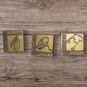 Complete set of six Coca-Cola Nagano 1998 Olympic pins. Features unique designs with gold tones.