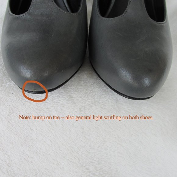 Previously loved -- one bump on toe (see photo) and some scuffing. Still beautiful with lots of sole left.