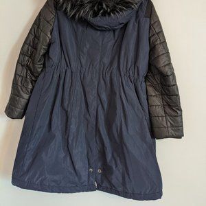 Like new condition (worn twice). Labeled as a size Euro 52 (which translates to a UK 24 or US 20) and I would say the sizing is accurate. I am wearing it at a size 16/18 in photos and have lots of wiggle room in the shoulders/arms and through the body and waist. There is a drawstring waist to pull it in, which creates a nice shape, as well as an inner lined jacket front that can zip up whilst the coat is still open. Sleeves have cuffs, there is in inner pocket and 2 outer pockets that snap.
