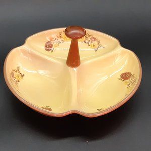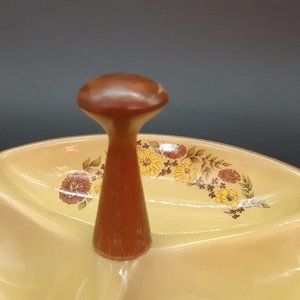 A vintage condiment serving tray or bowl made by Taylor Smith and Smith in the US during the 1950s. It is from their "Indian Summer" line and features brown and yellow flowers with green and brown leaves on a yellow background. It has a wooden handle and the underside is in brown. There are no markings but it is a clear match for the pattern; most of the wear is on the handle.