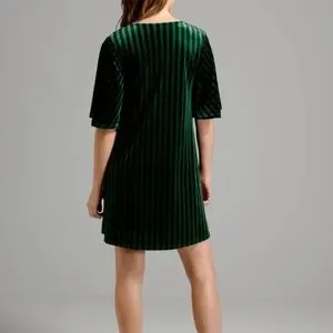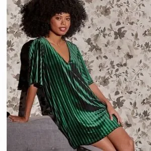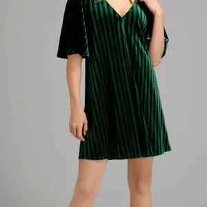 In a deep emerald green and black striped print, this luxuriously soft shift dress from our ModCloth namesake label is both super stylish and irresistibly comfortable. Made from a stretchy velvet fabric, this subtly spooky babydoll dress boasts a deep-V surplice neckline, open short sleeves, and a retro-chic easy-fit silhouette that finishes above the knee.