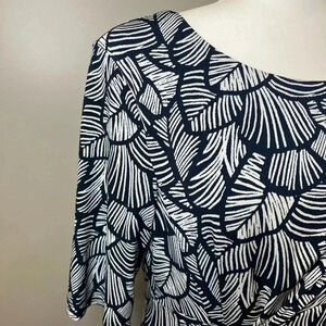 Excellent condition! Skirt wraps in front with ruched gathering. Lined. Palm leaf pattern. Rounded collar. Polyester/ spandex blend.