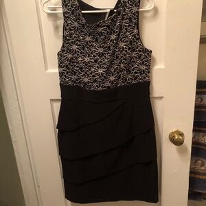 Connected Apparel Black Sleeveless Dress with Sequin Accents - Size 10 -used Slightly. Although the pictures do not show it, there are soft ruffles going in a diagonal down the dress. Perfect little black dress for all those special events, Christmas, wedding, dinner engagements and more. There is a little stretch to the dress.