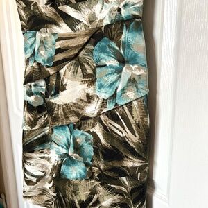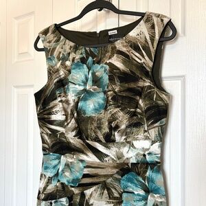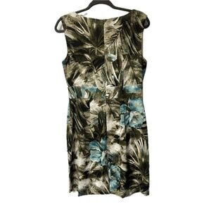 Great Transitional Dress! Tropical Print featuring Khaki/Turquoise/Neutrals can be left sleeveless for warm weather or covered up for chilly evenings. Tiered front adds interest to the fitted waist sheath silhouette. Back Zip and vent. Lined front. Easy care 97%Polyester 3%Spandex makes it a perfect travel piece. Made in Sri Lanka. Size 10. Approx flat measurements: Bust18.5” Waist15.5” Hip18” Length37”