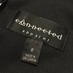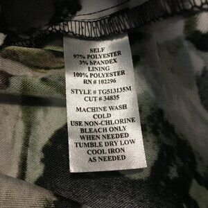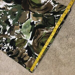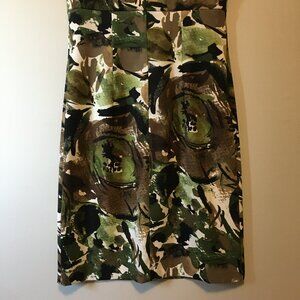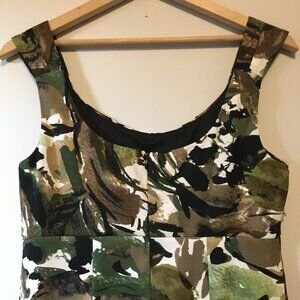Very good preowned condition, high empress waist, sleeveless midi dress by Connected Apparel featuring an all round abstract wash jungle-esque pattern in green, olives, browns, tan, black and white. Beautiful gathered pleats at the collar, flattering cuts and triangular shoulder straps, make this dress stand out among others.