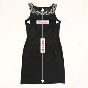 Connected Apparel Women Black Knee Length Sleek Dress with Rhinestone Neckline in size 8. This sleeveless dress features a round neckline and a zip closure for easy wearing. Made of a blend of 97% polyester and 3% spandex, this sheath style dress is perfect for various occasions including travel, weddings, parties, casual outings, and even workwear. The neckline rhinestone accents add a touch of elegance to this versatile piece, suitable for summer, fall, and spring seasons. Hand wash only for garment care.