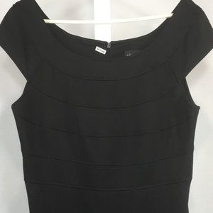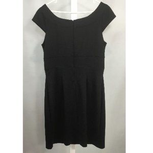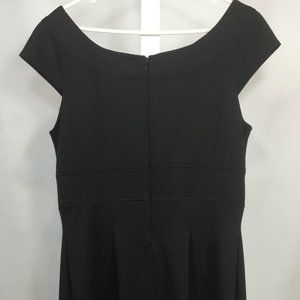 Sleeveless black dress has seamed bodice. Off the shoulder style, pleats at back waist. Excellent condition.