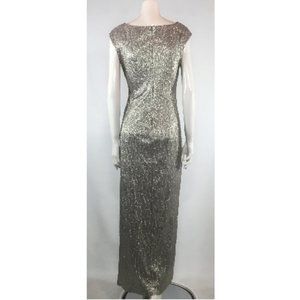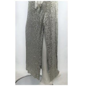 Like new. Draped neckline on shimmery jersey knit dress. Full length, slit to knee on left side. Sleeveless, fully lined. Back zip, tucks at left waist. Perfect for travel. The colour is not exactly silver and not exactly gold, perhaps you'd call it champagne?