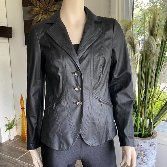 Conrad C Black Faux Leather Lightweight Blazer Jacket Sz 6. Polyester, machine washable, lined, Button up closure, zippered front pockets, (extra button in pocket). Measurements: P to P: 18.5"/ Sleeves: 23.5"/ Length: 24.5"/ shoulder to shoulder: 16". In excellent preowned condition.