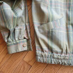 Gorgeous greens in the plaid. Zip up to collar. Elastic waist. Shirt Button Cuffs. Shoulder padding. Lined.