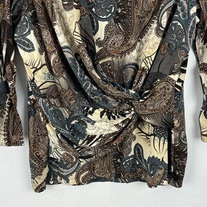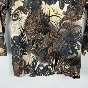 Conrad C Top Blouse Size L Brown Beige Paisley 3/4 Sleeve Round Neck Stretch