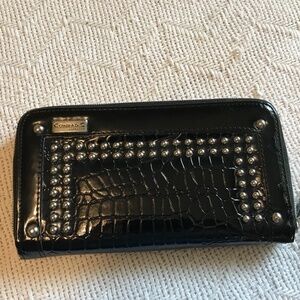 Conrad C faux leather patent wallet. Full zip around style. Perfect size to use as a wallet or small clutch. Keeps cards and cash secure with full zipper. Approx. 7.5 inches in length. 4 inches in height. Silver studs add personality to this wallet. Smoke free home. Never used, new condition, just stored with a few very subtle marks from being stored.