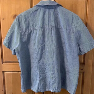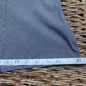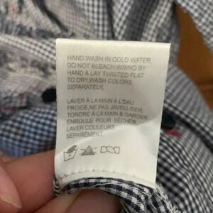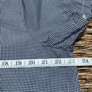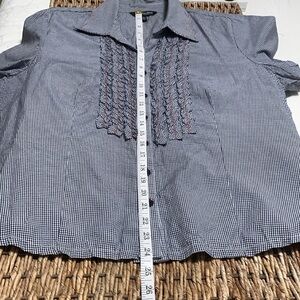 Navy and white gingham pattern with red stitching detail. Short sleeves. V neck with tuxedo ruffle and buttons. Fitted back. 100% cotton. Size 16 Petite.