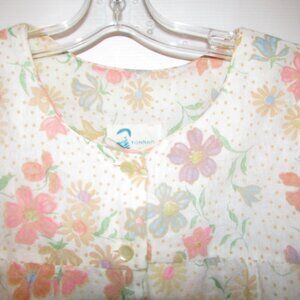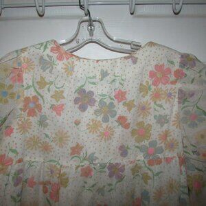 Beautiful sheer material with flocked dots and flowers in various colours - pinks, blues, pruples, green, golden tans on off-white background.