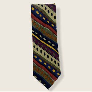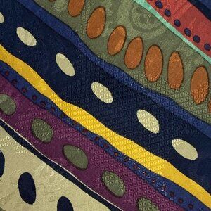 100% Silk Multicolour Consenso Uomo Milano Italy Tie. Alternating stripes and polka dots. Blue, purple, cream. Very good pre-loved condition. No visible flaws.