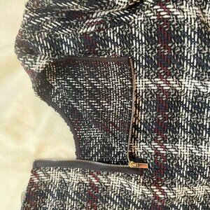 Contemporaine for Simons, SIZE XXL. Big textured tweed plaid cropped top with fringe on sleeves and bottom hem. Short sleeves. Zipper on the back Tweed is always a classic and always in style. Will look great on a smaller size woman for that roomy look. Oversize, Academia, Old Money.