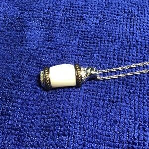 Beautiful contemporary set consisting of a sterling silver chain with a pendant featuring a translucent white stone with crystal inlay and gold plating. Matching stud earrings with clip fastenings.
