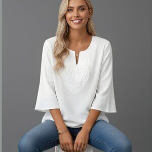 Contrast Lace V-Neck 3/4 Sleeve Cotton Blouse White