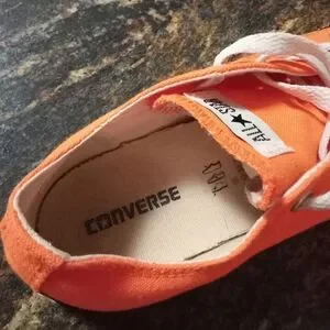 Converse All Stars in bright orange. Size on the tongue is youth 35 but I am a 6 and they fit perfectly.
