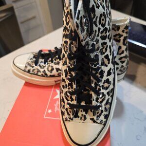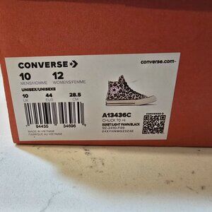 The product is a pair of Converse Chuck 70 sneakers in a leopard print color, featuring glow-in-the-dark details. Specifically designed for men, with a UK shoe size of 10 and a corresponding US size of 10, these athletic shoes are perfect for activities such as walking, school, and skateboarding. The sneaker style code is A13436C, making them part of the Converse Chuck 70 product line, known for their durability and comfort for everyday wear. With a unique and stylish design, these sneakers offer both style and functionality for the modern man.