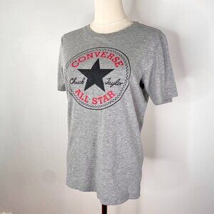 ⋆ This grey graphic t-shirt features a rounded collar and displays the iconic Chuck Taylor round star logo on the front, with bold black and red text. Casual t-shirt is great for skaters, streetwear enthusiasts, and anyone who appreciates classic, laid-back style with a nod to vintage athletic culture.