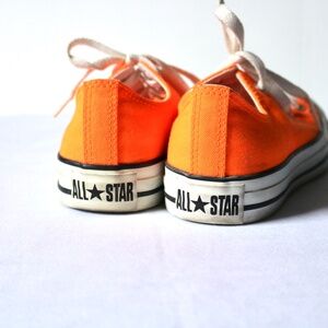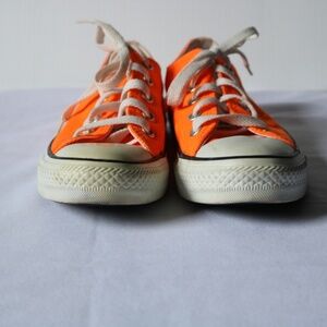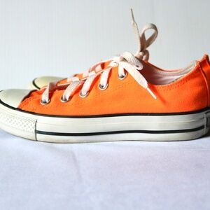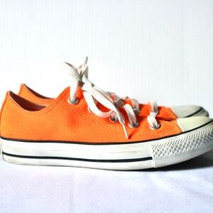 Converse All Star lace-up sneakers in women's size 6 (Men's 4). Bright orange (neon) with white laces. Pre-owned but in great condition. NOTE: the rubber on the toe of the right shoe has yellowed slightly. Smoke-free, pet friendly home!