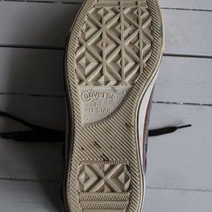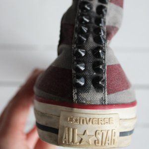 These special edition Converse Hi-Tops feature a faded American flag in hues of dark red and grey on the canvas. Stud detailing and black laces give them an edgy vibe.