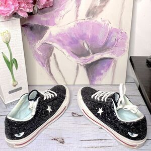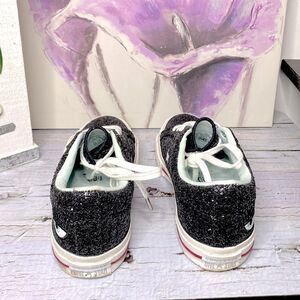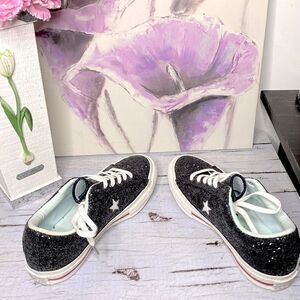 Stylish black glitter sneakers. Features white laces and star detail. Perfect for casual wear.