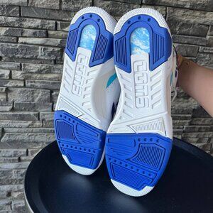 Designed with a mix of clean white leather and striking blue, teal, and purple accents, these kicks are a perfect blend of vintage basketball flair and modern street style.