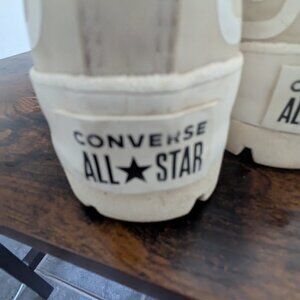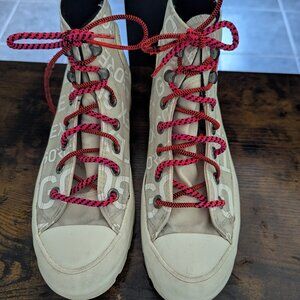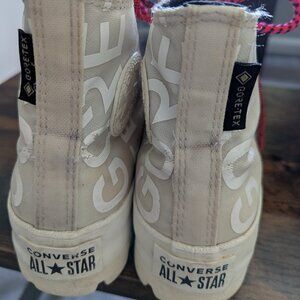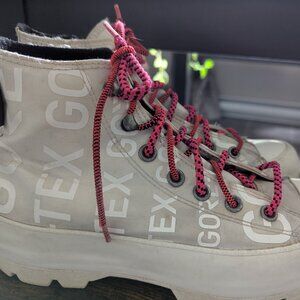 High-quality canvas with GORE-TEX offering a classic Chuck look in a weather-ready version. Premium high-top cut. Size 8. Taupe color with cream-colored details. Thick cream rubber sole. Sole length: 27 cm by 9.5 cm wide. Total height: 15 cm. Pink and black laces. 10 eyelets in total with 2 hook attachments. Faint spots almost not noticeable (see last photo). Black interior.
