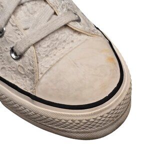 Step into spring with these adorable white lace Converse! They're in excellent condition and have only been worn a few times. There are a few scuff marks on the front, but I'm sure it's easily removeable. Other than that, these shoes are clean. The delicate lace detailing adds a feminine touch to the classic Converse style, making them perfect for dressing up or down.