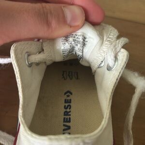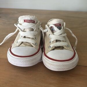 Classic white Converse All Star low tops in toddler size 5. These iconic kicks feature a canvas upper, rubber toe cap, and durable sole—perfect for your little trendsetter. Red and navy accents add that signature Converse charm. Lightly worn with some signs of use (minor wear on canvas and laces), but still in good shape and ready for more adventures.