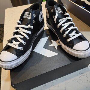 The Converse Chuck Taylor All Star Malden Street Boots in black are men's sneakers with a mid-top design. They feature a lace-up closure, rubber outsole, cushioned insole, and breathable lining for comfort. Suitable for activewear, casual, and workwear occasions, these sneakers are water-resistant and non-slip. The versatile style is accented with stars and designed for outdoor activities and athleisure. Ideal for various performance activities like gym training, walking, and hiking, these Converse sneakers in size 10 offer a classic and functional option for everyday wear.