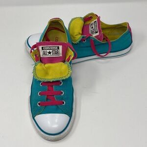 Super cool Converse Chuck Taylor All Star sneakers in bright colour block tones if turquoise, pink and lime green. Double tongue so you can show off your colours, pink laces, white and turquoise side walls, these beauties are in very good clean condition.