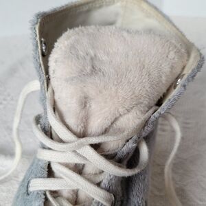 Part of the Converse x Looney Tunes collaboration. High-top faux-fur sneakers in grey and off-white. Round rubber cap toe in off-white. Lace-up closure in white. Multicolor embroidered logo patch at outer side. Eyelet vents and multicolor logo patch at inner side. Canvas lining. Treaded rubber sole in off-white featuring tonal rubberized logo applique at heel. Silver-tone hardware.