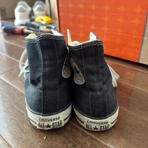 Stylish black high-top sneakers featuring white laces. Perfect for casual wear. Men’s size 7, women’s size 9