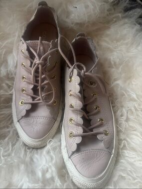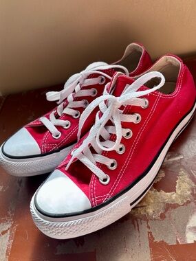 These out of stock Converse are used but in very good condition. There is minor wear/dirt to the soles, heels and heel tags from use. They are women's US size 6.5.