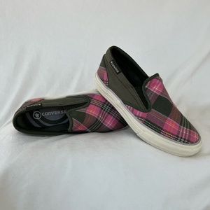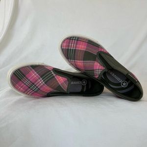 Pink, green, orange and white plaid fabric Converse slip on sneakers