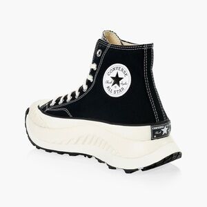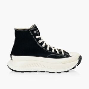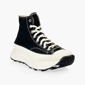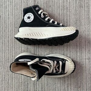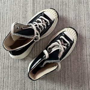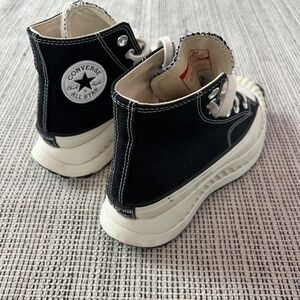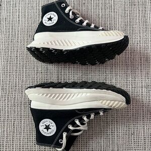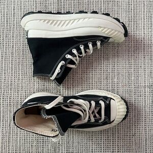 Stylish Converse combat boots. Black canvas with white accents. Chunky sole for added height.