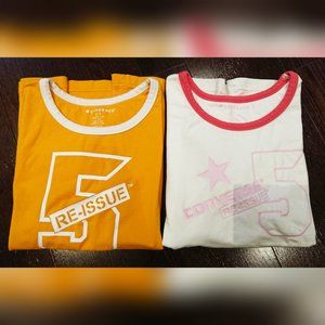 Both T-shirts have been worn plenty over the years but they are in good condition. Slight pilling, both are super stretchy and comfy to wear. The orange T-shirt has a few tiny dot stains, please see the photos.