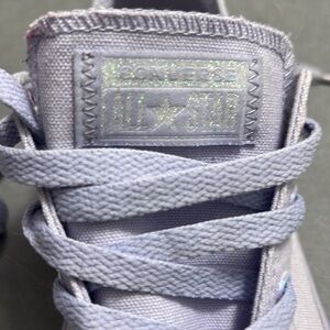 Soooo cute these Converse Youth Chuck Taylor All Star Sneakers in a lovely lilac canvas. Featuring the classic cap-toe design and lace-up closure, these sneakers offer timeless Converse charm with a playful twist. The leather back and lace holes add a stunning iridescent finish, giving them a unique and eye-catching appeal. The lightweight, durable canvas ensures all-day comfort, while the rubber sole provides reliable traction. Perfect for casual outings or everyday wear, these shoes are in great shape and exceptionally clean, ready to complement any wardrobe! Style number: 364820C.