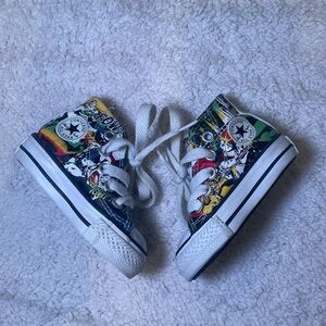 These Converse sneakers boast a striking blue and green color scheme, enhanced by a lively comic book-inspired print. The classic high-top design is paired with a contrasting white sole and toe cap, ensuring both style and comfort. Ideal for those looking to make a bold fashion statement.