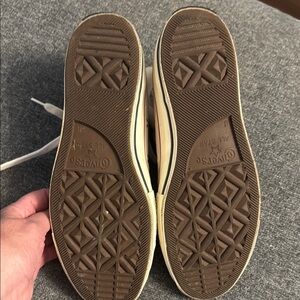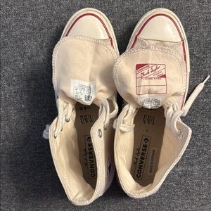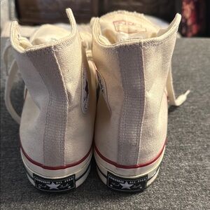 Worn once! Like new! These Converse sneakers feature a timeless high-top design with a durable canvas upper and a signature rubber toe cap. The white color offers a versatile look, while the iconic circular All-Star patch adds a touch of classic style. Perfect for everyday wear, these sneakers provide comfort and a traditional lace-up closure for a secure fit.