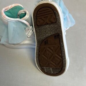 These Converse sneakers showcase a classic design with a white canvas upper and subtle blue accents. Featuring a durable rubber sole and iconic low-top silhouette, they offer both style and comfort for everyday wear. Double sided zippers for easy dressing.