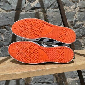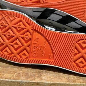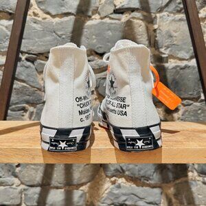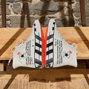 High-top silhouette in ivory canvas with signature Off-White text print at sides. Black and white diagonal stripe midsole. Round rubber toe cap. Bright orange rubber outsole with Converse All Star branding. Orange Off-White removable zip tie at the right shoe. White laces with printed “SHOELACES". Converse Chuck Taylor patch on the inner sides. Converse heel patch in black and white. Made in Vietnam. Come with shoe box.